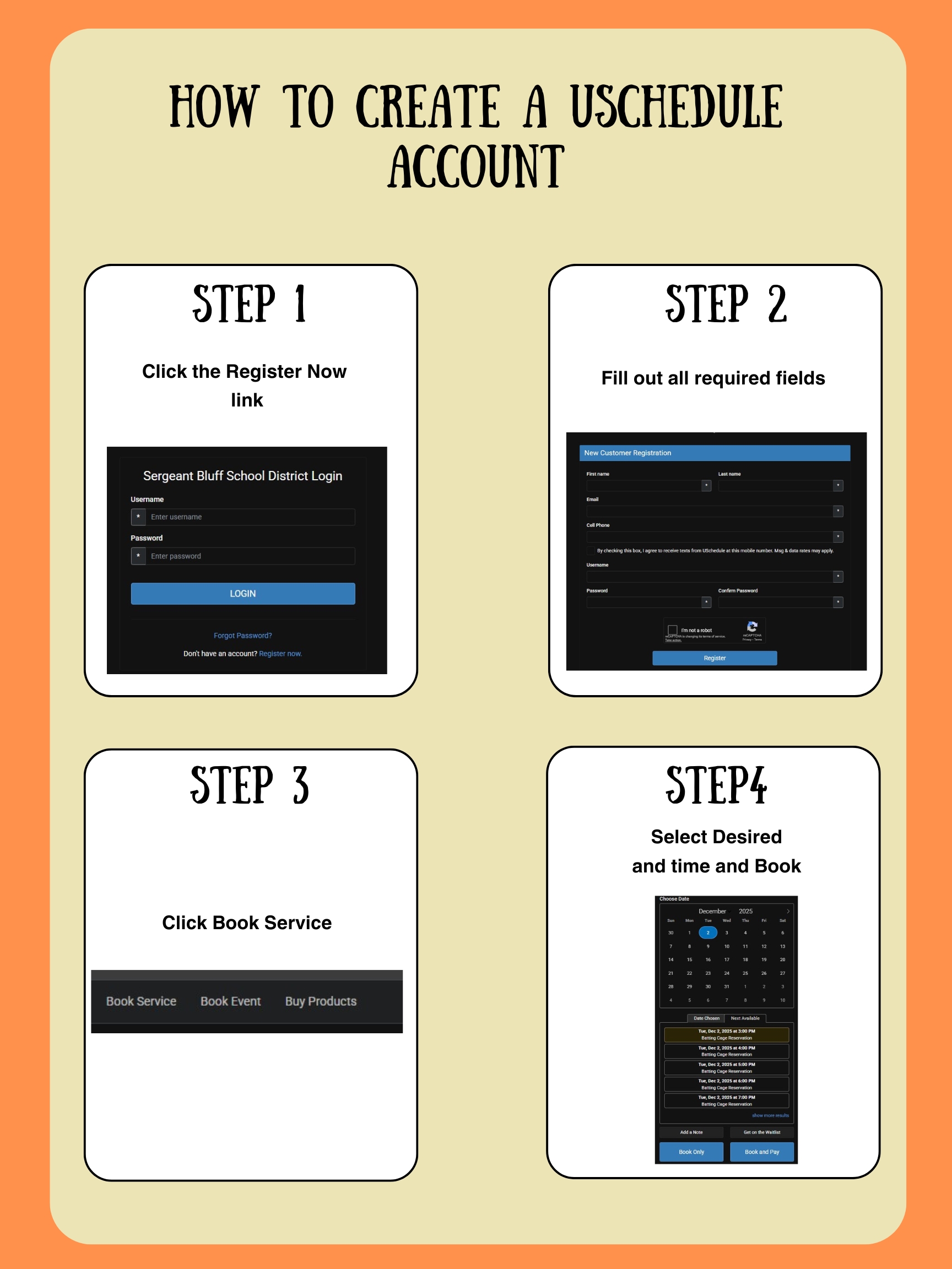 In order to reserve times, an account must be created by clicking Register Now (See steps 1-4 on this page).